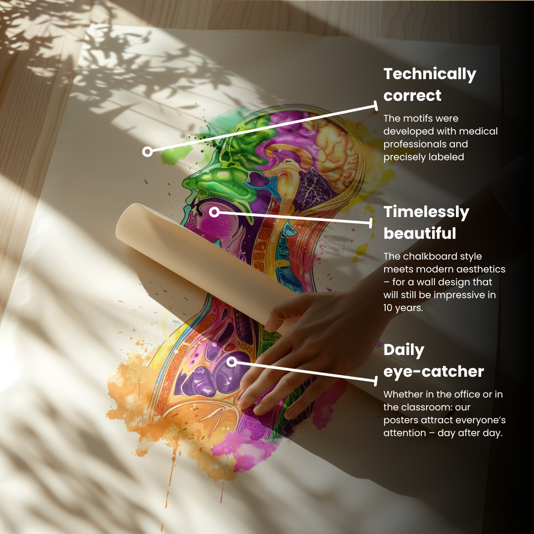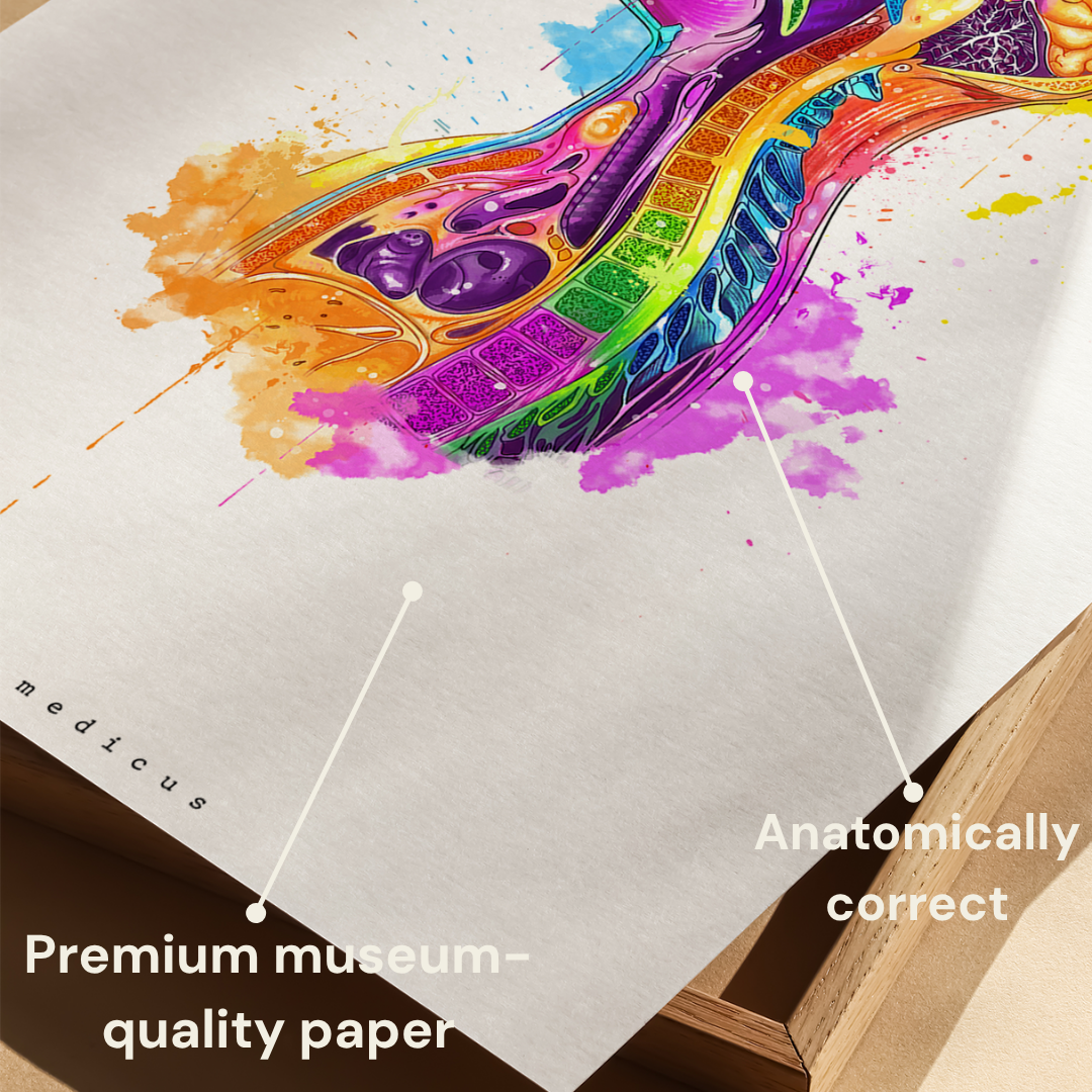 The poster combines medical accuracy with an artistic touch by presenting the multi-layered details of the thorax in a spectrum of watercolors. Ideal for medical professionals, educators, and anyone who wants to develop a deep understanding of thoracic anatomy. The Rainbow-style Thoracic Anatomy Poster is an educational work of art that stands out in any room, creating a dynamic and inspiring atmosphere. It is also the perfect gift for healthcare professionals or anyone interested in human anatomy. Printed on high-quality paper and finished with a UV-protective laminate, this poster ensures long-lasting color brilliance and will arrive in perfect condition. It is a colorful addition to any environment that values education and aesthetics.